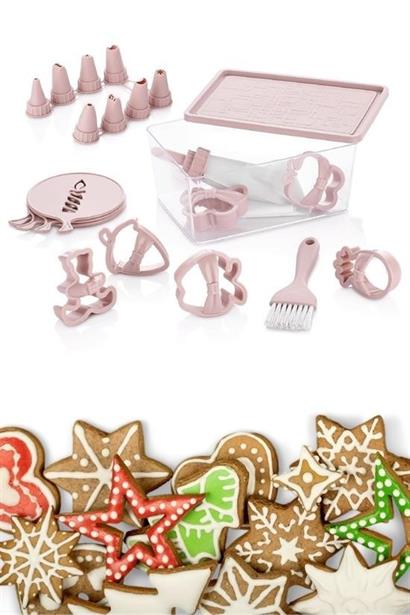 Kurabiye seti olarak da adlandırılan ürünümüzün içinde; kurabiye kalıpları, krema torbası, şekilli kapaklar, süsleme şablonları, yumurta fırçası ve saklama kabı yer alıyor