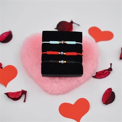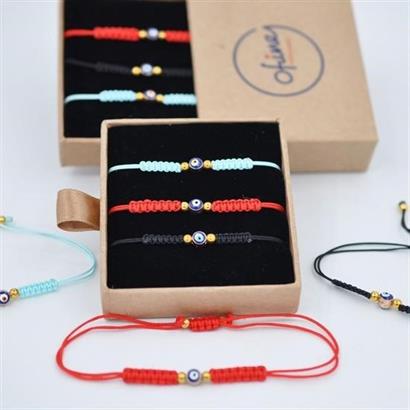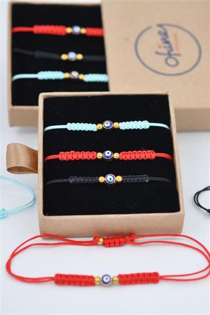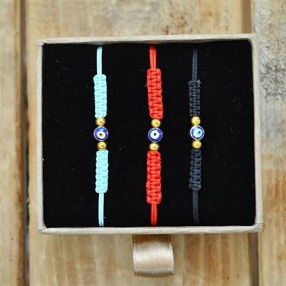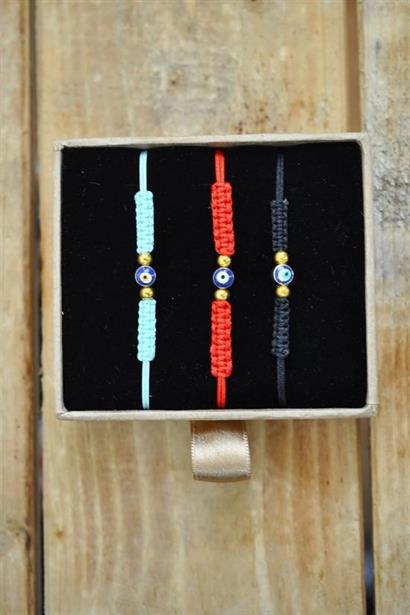 Ürünümüz sevdiklerinize şans ve uğur getirmesi için tek adet küçük nazar boncuğu içermekle beraber tek bir kutuda nazar boncuklu örme kırmızı, mavi ve siyah ip bileklikleri içermektedir