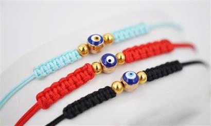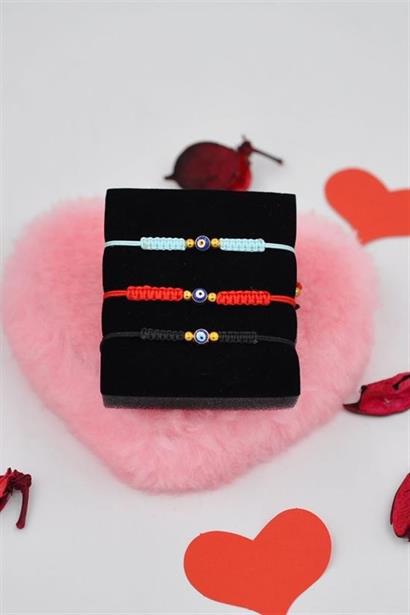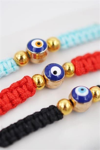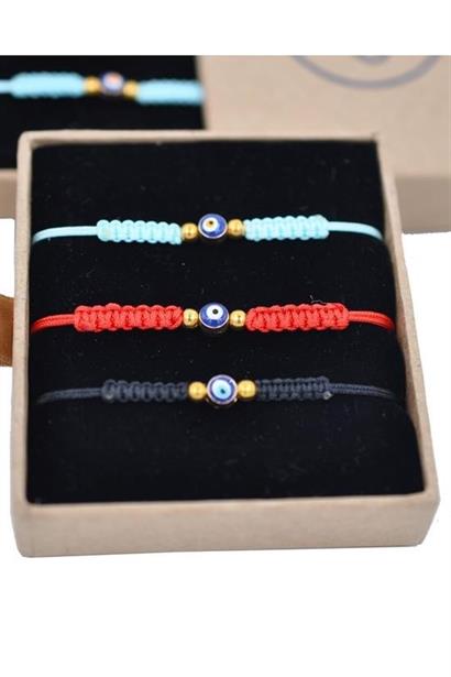 Tek nazar boncuklu, örgülü, üç farklı renge sahip, şans ve uğur getiren ip bileklik bijuteri ürünümüz; anneniz, kardeşiniz ve siz kullanabileceğiniz gibi aynı zamanda üç yakın arkadaş grubunuz için de tercih ederek yakın arkadaşlarınızı mutlu edebilirsiniz
